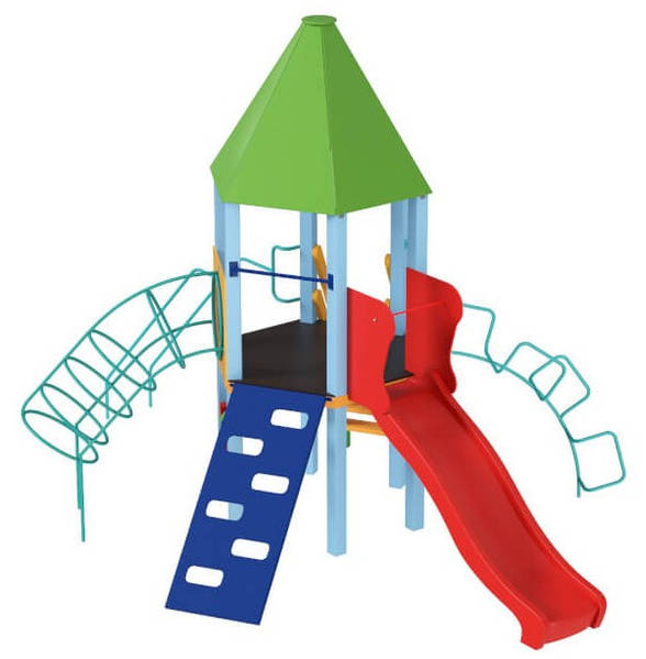 - Конструкция состоит из нескольких элементов, включая башню, горку и другие игровые платформы.