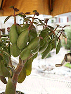 У денежного дерева листья расположены на вытянутых, тонких и гибких черешках. Они имеют длину, которая позволяет листу свеситься и закрыть область пространства под ним. Такое положение листьев позволяет денежному дереву максимально использовать свет, так как они не перекрывают друг друга.
