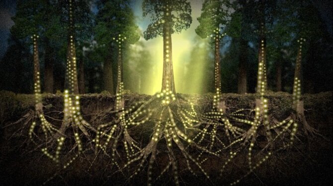 Грибные гифы выполняют роль некоего нервной системы для деревьев, позволяя им обмениваться информацией и ресурсами. Эти гифы являются результатом симбиотического взаимодействия между корнями деревьев и мицелием грибов. Мицелий — это сеть грибных гиф, распространяющаяся в почве и участвующая в обмене веществами между грибом и растением.